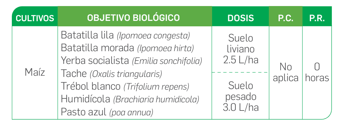 Herbicida Atrazina selectivo para ser aplicado en pre-emergencia o en emergencia temprana de malezas. Controla malezas de hoja ancha y gramíneas anuales en cultivos de maíz.